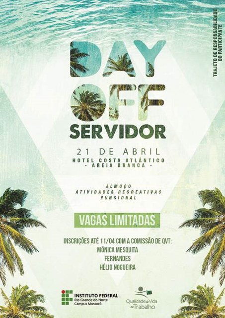 Neste sábado dia 21/04/2018 a ASIFRN esta patrocinando o evento que acontecerá no campus Mossoró o DAY OFF, evento para os servidores, está ação e uma realização do programa de qualidade de vida, nesta programação vai acontecer uma manhã de atividade tais como: treinamento funcional,voleibol beach ,lanche saudável,almoço e jogos recreativos.