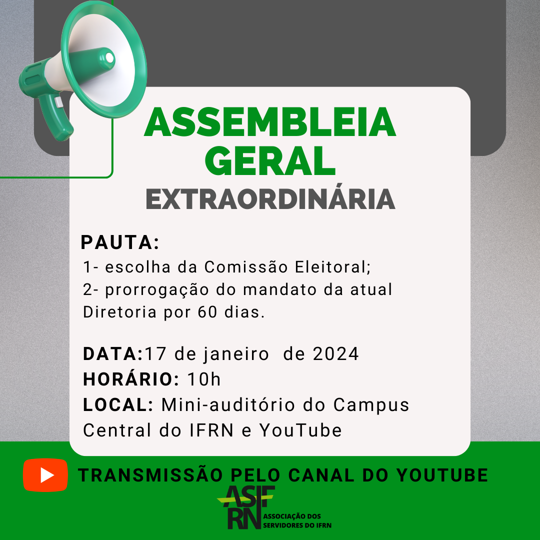 No dia 17 de janeiro de 2024, realizaremos uma Assembleia Geral Extraordinária, a partir das 10h em formato presencial e remoto, no Mini auditório do campus Natal Central do IFRN, com transmissão pelo nosso canal no YouTube.