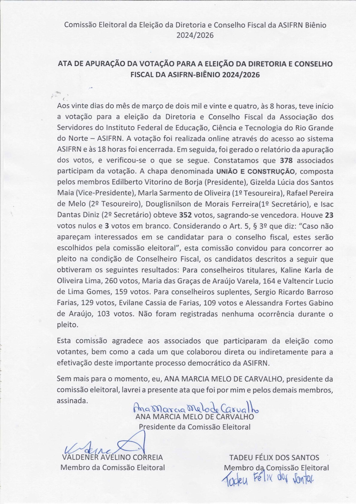 Eleições ASIFRN: Resultado da eleição