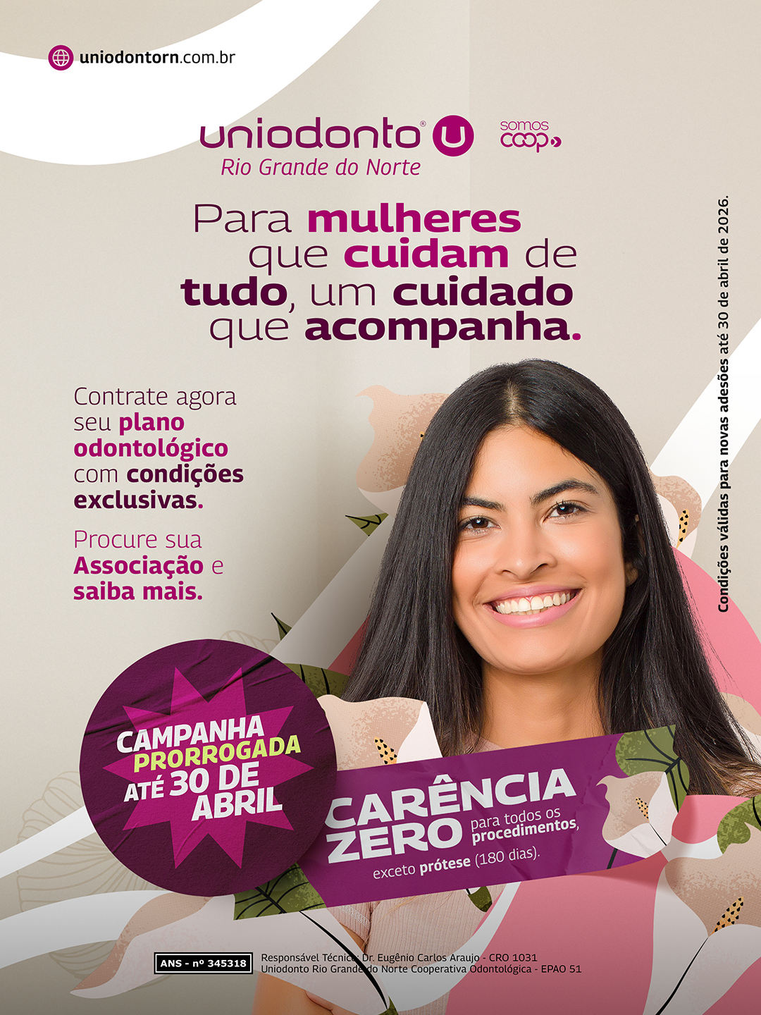 TODAS as NOVAS ADESÕES sejam elas de titulares e/ou dependentes, enviadas entre os dias 01/04/2026 até 30/04/2026, entrarão com CARÊNCIA REDUZIDA, ou seja, ZERO para todo e qualquer procedimento descrito em nosso rol de cobertura, com exceção da prótese/coroa, que permanecerá com 180 dias de carência.